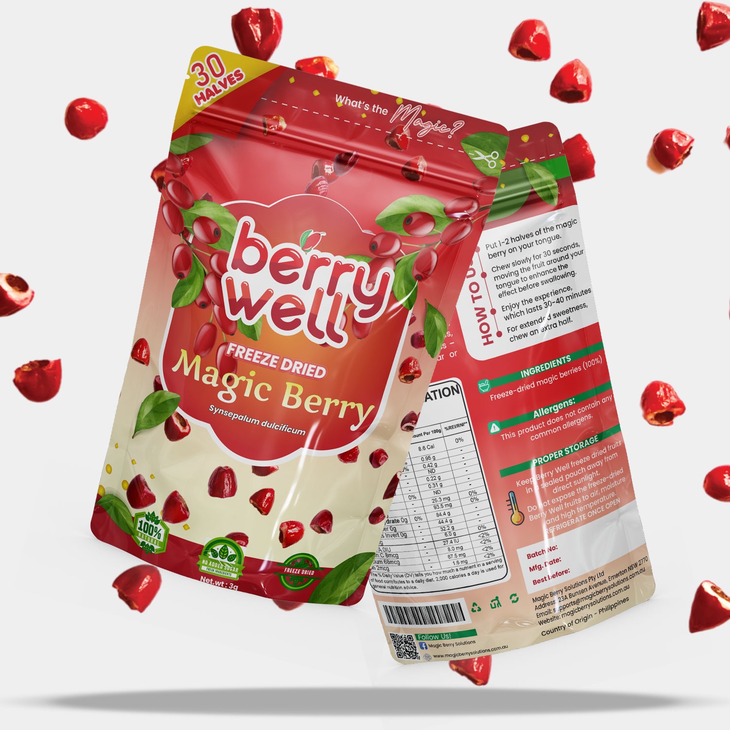 🌟 Transform Flavors – Place half a Berry Well Magic Berry on your tongue, roll it around, and enjoy sour or bitter foods turned sweet! Try it with lemons, strawberries, yogurt, or kombucha.